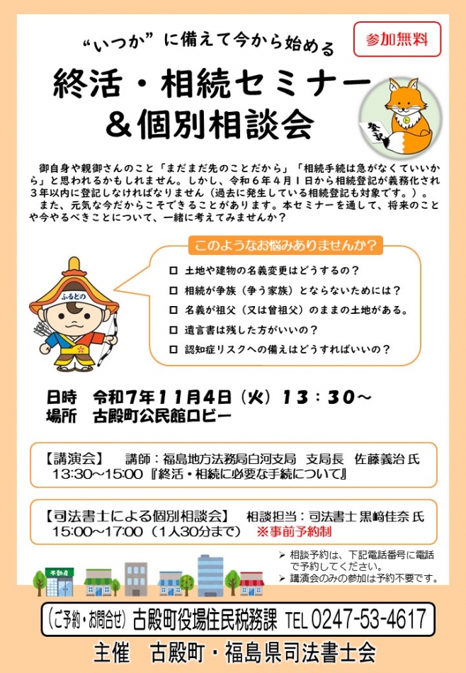 令和7年11月4日(火)に古殿町公民館にて『終活・相続セミナー&個別相談会』が開催されます。参加無料です。