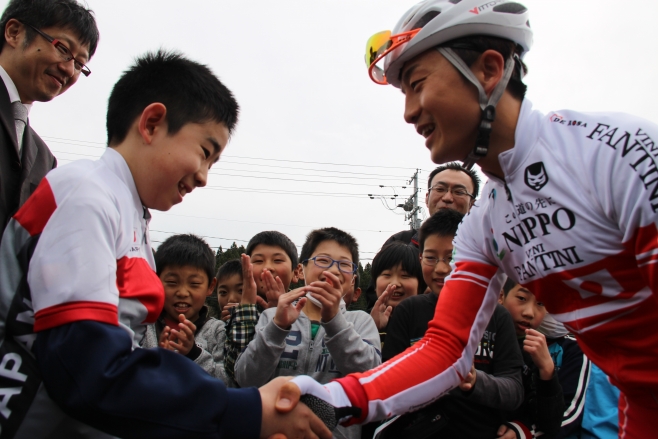 2016リオデジャネイロオリンピックの自転車トラック競技オムニアム日本代表・窪木一茂選手(鎌田出身)が、4月8日オリンピック出場報告のため来町しました。窪木選手は、町内を赤白の国旗を彷彿とさせるユニホームで走行し、古殿小学校では、全校生徒による歓迎と応援がされました。