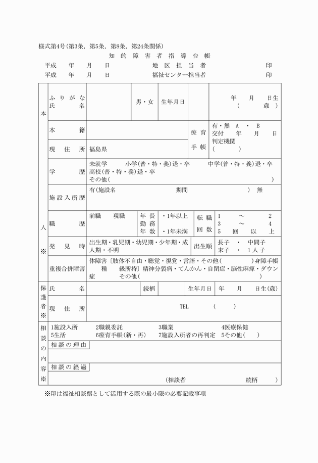 3 町長は,児童相談所から児童福祉法第63条の5の規定により通知を受けたときは,知的障害者指導台帳(様式第4号)を作成し,更生援護の実施に努め,必要に応じ措置を行うこととする。