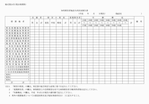 第23条 施設長は,施設入所の状況を毎年4月及び10月の初日現在における知的障害者施設入所状況報告書(様式第24号)を作成し,当月10日までに,町長に提出するものとする。