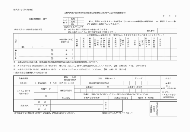 第7条 町長は前条の規定により口座振替依頼書の提出があったときは,納税通知書にあっては納税者等に,納付書にあっては指定金融機関等に送付しなければならない。