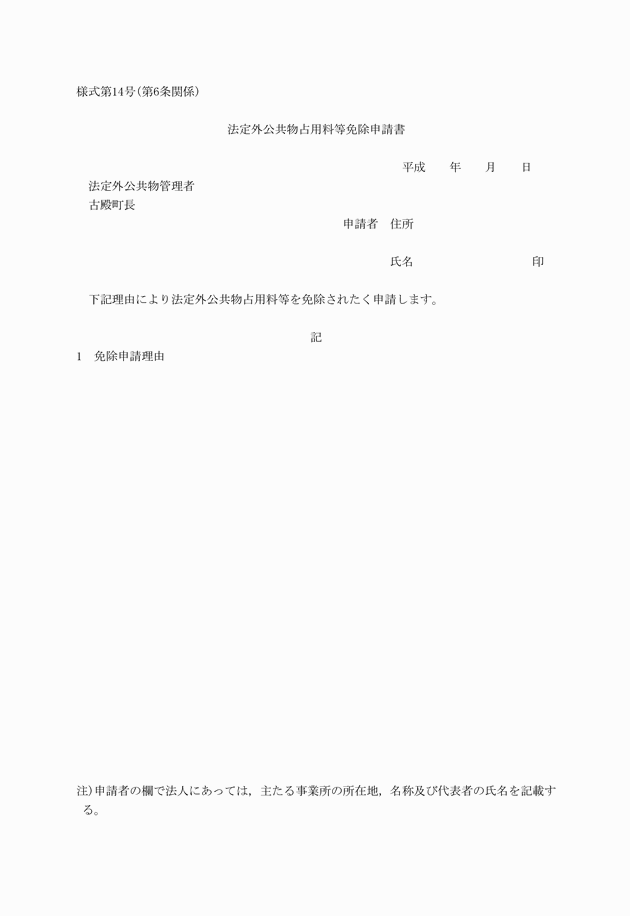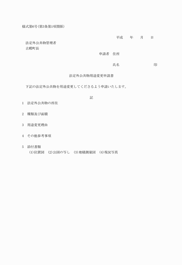 第3条 法定外公共物の用途を変更しようとする者は,必要な関係書類を添えて法定外公共物用途変更申請書(様式第6号)を町長に提出し,その承認を得なければならない。