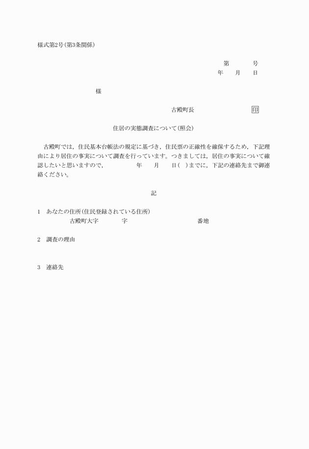 第1条 この規程は,住民基本台帳法(昭和42年法律第81号。以下「法」という。)第8条及び住民基本台帳法施行令(昭和42年政令第292号。以下「政令」という。)第12条の規定に基づき,古殿町に住民票を有する者について,実態調査による住民票の削除又は修正(以下「削除等」という。)を職権で行うにつき,法及び政令に定めるもののほか,必要な事項を定めるものとする。