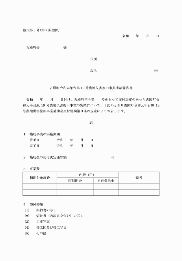 第9条 補助事業者は,補助事業が完了したときは,速やかに古殿町令和元年台風19号農地災害復旧事業実績報告書(様式第5号)に次に掲げる書類を添えて,町長に提出しなければならない。