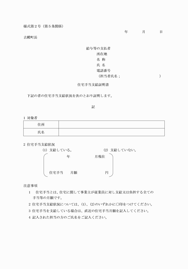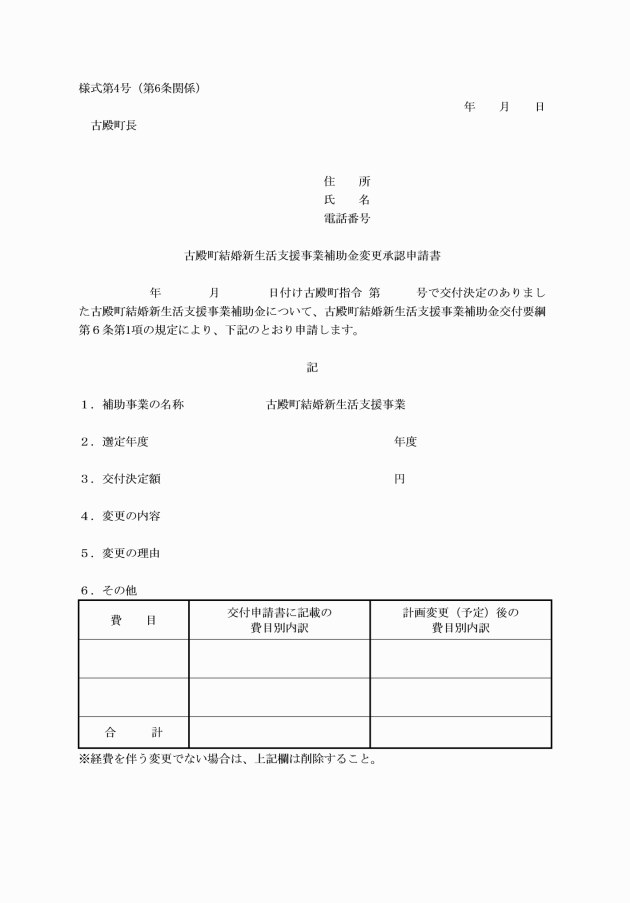 第5条 補助金の交付を受けようとする者(以下「申請者」という。)は,古殿町結婚新生活支援事業補助金交付申請書(様式第1号。以下「申請書」という。)に次に掲げる書類を添えて,令和7年3月31日までに町長に提出しなければならない。